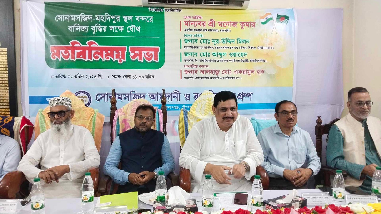 সোনামসজিদ-মহদিপুর স্থলবন্দরে বানিজ্য বৃদ্ধির লক্ষ্যে বাংলাদেশ-ভারতের দুই দেশের ব্যবসায়ী নেতৃবৃন্দদের নিয়ে যৌথ মতবিনিময় সভা অনুষ্ঠিত হয়েছে। সোমবার দুপুরে চাঁপাইনবাবগঞ্জের সোনামসজিদ স্থলবন্দর আমদানি-রফতানিকারক গ্রুপের সম্মেলন কক্ষে এই সভা অনুষ্ঠিত হয়। মতবিনিময় সভায় বাংলাদেশ ও ভারতের আমদানি-রফতানিকারকরা উপস্থিত ছিলেন। সভায় প্রধান অতিথি হিসেবে উপস্থিত ছিলেন, রাজশাহীস্থ ভারতীয় সহকারী হাইকমিশনার শ্রী মনোজ কুমার।