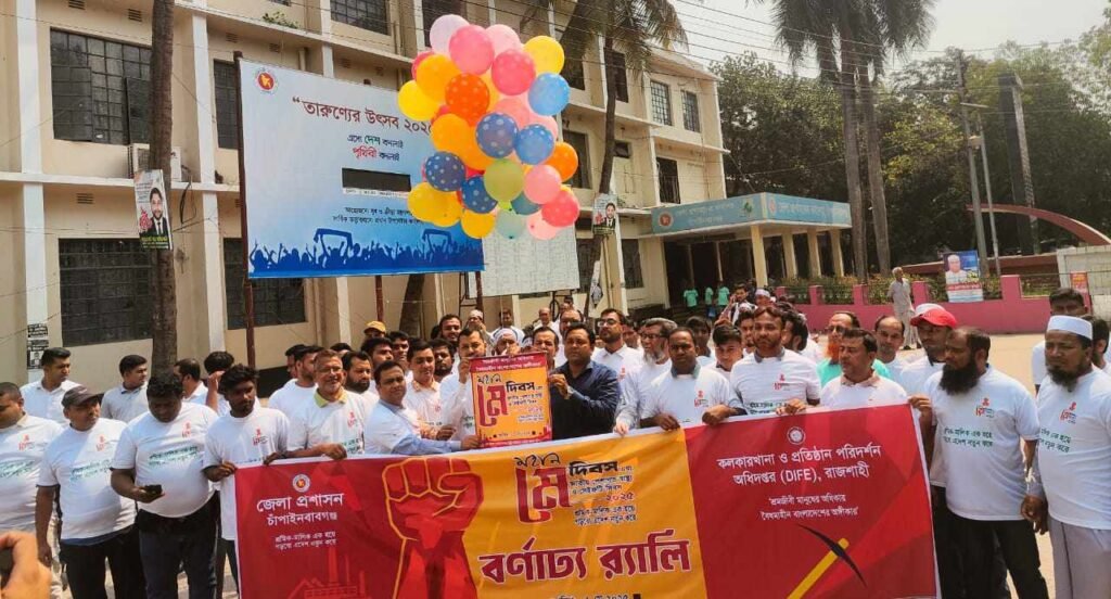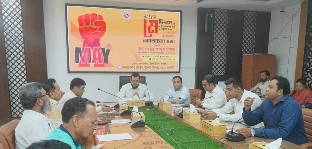 “শ্রমিক – মালিক এক হয়ে গড়বো এদেশ নতুন করে ” শ্লোগানকে সামনে রেখে চাঁপাইনবাবগঞ্জে মহান মে দিবস উপলক্ষে রালী ও আলোচনা সভা অনুষ্ঠিত হয়েছে। ১ মে বৃহস্পতিবার সকাল সাড়ে ৯ টায় চাঁপাইনবাবগঞ্জ জেলা প্রশাসন ও রাজশাহী কলকারখানা ও প্রতিষ্ঠান পরিদর্শন অধিদপ্তর এর আয়োজনে জেলা প্রশাসকের সামনে থেকে রালী বাহির হয়ে শহরের গুরুত্বপূর্ণ সড়ক প্রদিক্ষণ শেষে জেলা প্রশাসকের সম্মেলন কক্ষে আলোচনা সভা অনুষ্ঠিত হয়। জেলা প্রশাসক মোঃ আব্দুস সামাদ এর সভাপতিত্বে স্বাগত বক্তব্য রাখেন রাজশাহী