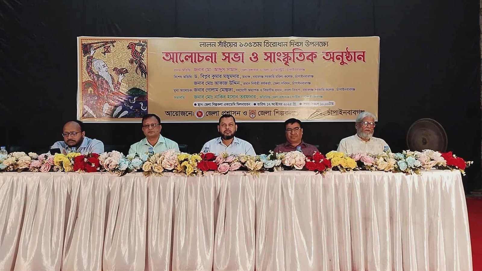 চাঁপাইনবাবগঞ্জে উদযাপিত হয়েছে লালন সাঁইয়র ১৩৫তম তিরাধান দিবস। “মানুষ ভজল সোনার মানুষ হবি” ফকির লালন সাঁইয়ের এই কালজয়ী মানবতাবাদী বাণীকে ধারণ করে দিবসটি উপলক্ষে শুক্রবার (১৭ অক্টোবর) সকাল ১০টায় জেলা শিল্পকলা একাডমী মিলনায়তনে জেলা প্রশাসন ও জেলা শিল্পকলা একাডমীর যৌথ উদ্যাগে আয়োজন করা হয় আলোচনা সভা ও সাংস্কৃতিক অনুষ্ঠান। এতে প্রধান অতিথি ছিলেন জেলা প্রশাসক (যুগ্ম সচিব) মো. আব্দুস সামাদ। বিশেষ অতিথি ছিলেন নবাবগঞ্জ সরকারি মহিলা কলজর অধ্যক্ষ ড. বিপ্লব কুমার মজুমদার এবং জেলা পরিষদের প্রধান নির্বাহী কর্মকর্তা মো. আফাজ উদ্দিন, চাঁপাইনবাবগঞ্জ প্রেসক্লাবের সভাপতি সিনিয়র সাংবাদিক গোলাম মাস্তফা মটু। অনুষ্ঠানে সভাপতিত্ব করেন অতিরিক্ত জেলা প্রশাসক (সার্বিক) মো. নাকিব হাসান তরফদার। বক্তারা, লালন সাঁইয়ের জীবনদর্শন, মানবপ্রেম ও সাম্যর চেতনা তুলে ধরেন। তাঁরা বলেন, লালনের বাণী শুধু সংগীত নয়, এটি এক গভীর জীবনদর্শন, যা মানুষ মানুষ বিভেদ ভুলে ঐক্যর বার্তা দেয়। তাঁর ভাবধারা আজও সমাজ সম্প্রীতি ও মানবতার আলো ছড়াই। জেলা প্রশাসক মো. আব্দুস সামাদ বলেন, লালন সাঁইয়ের শিক্ষা আমাদর শিখিয়েছে ধর্ম, জাতি বা বর্ণর ঊর্ধ মানুষই সর্বাচ্চ। তাঁর দর্শন আজও প্রাসঙ্গিক। আমরা যদি লালনের মানবতার বাণী জীবন ধারণ করত পারি, তবে সমাজ থেকে ঘৃণা, হিংসা ও বৈষম্য দূর হবে। লালনের দর্শন অনুপ্রাণিত এই আয়াজনটি চাঁপাইনবাবগঞ্জ মানবতা ও ঐক্যের এক নতুন সুর ছড়িয় দিবে। আলাচনা শেষে শিল্পীদর অংশগ্রহণে পরিবশিত হয় সাংস্কৃতিক অনুষ্ঠান। শিল্পীরা পরিবশন করেন লালন গীতি, বাউল সুর ও মানবতার গান। দর্শক-শ্রোতারা লালনের মহত্বের দর্শনে মুগ্ধ হয় গানগুলার সাথে গলা মেলান। এসময় উপস্থিত ছিলেন সংস্কৃতি কর্মী, শিক্ষক, ছাত্রছাত্রী, সাহিত্যপ্রেমী ও বিভিন শ্রেণি-পেশার মানুষ।