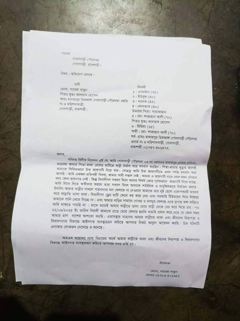 রাজশাহীর গোদাগাড়ী পৌরসভার ৩নং ওয়ার্ডের মাদারপুর ডিমভাঙ্গা এলাকায় এক অসহায় শারীরিক প্রতিবন্ধী বিধবা নারীর বসতভিটা দখলের চেষ্টা ও অমানবিক নির্যাতনের অভিযোগ উঠেছে। ভুক্তভোগী মোসা. সাবেরা খাতুন তার মাথা গোঁজার শেষ আশ্রয়টুকু রক্ষা এবং জীবনের নিরাপত্তা চেয়ে স্থানীয় প্রশাসন ও পৌরসভার দ্বারে দ্বারে ঘুরলেও দীর্ঘদিন ধরে কোনো প্রতিকার পাচ্ছেন না বলে জানা গেছে।