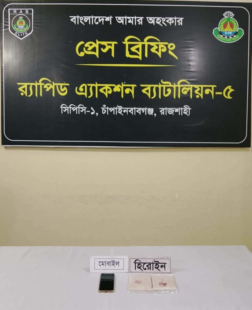 চাঁপাইনবাবগঞ্জ সদর উপজেলার চরবাগডাঙ্গায় নিজ বসতবাড়িতে অভিযান চালিয়ে ২০০ গ্রাম হেরোইনসহ আলী হোসেন (২৩) নামে এক মাদক কারবারীকে গ্রেফতার করেছে র্যাব-৫।