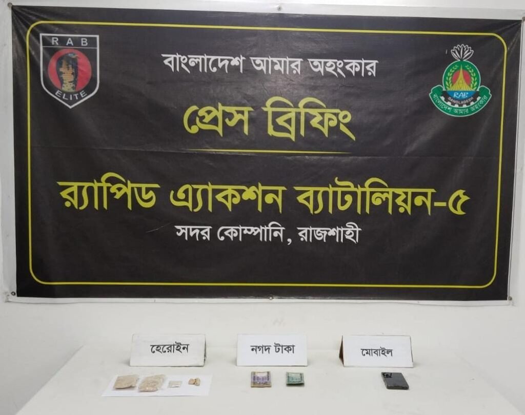 রাজশাহীতে অভিনব কায়দায় মাদক পরিবহনের সময় ১০৮ গ্রাম হেরোইনসহ মো. মামুন মোল্লা (৪০) নামের এক মাদক ব্যবসায়ীকে গ্রেফতার করেছে র্যাব-৫। রোববার (২২ মার্চ) বিকেলে মহানগরীর দামকুড়া থানাধীন হরিপুর কালুর ডাঙ্গা এলাকা থেকে তাকে গ্রেফতার করা হয়।