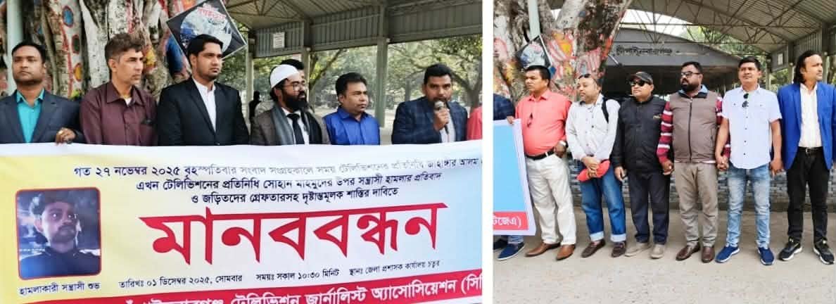 চাঁপাইনবাবগঞ্জে সংবাদ সংগ্রহের সময় সাংবাদিকের উপর হামলার প্রতিবাদে মানববন্ধন