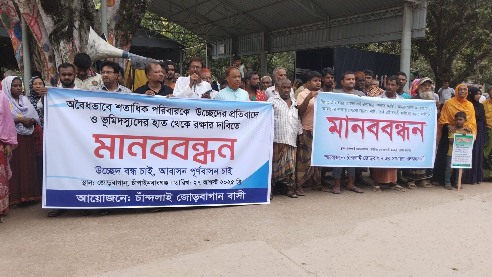 চাঁপাইনবাবগঞ্জ শহরের জোড়বাগানে অবৈধ উচ্ছেদ রোধে ভুক্তভোগীদের মানববন্ধন